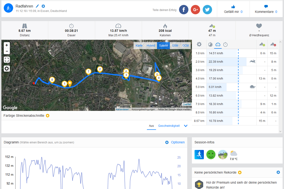 Auf unserer obligatorischen Fahrradtour muss sich das Huawei P Smart mit unserem Referenzgerät Garmin Edge 500 vergleichen lassen. Dabei erreicht das Android-Smartphone eine ähnliche Genauigkeit wie unser Vergleichsgerät. Die aufgezeichnete Strecke liegt dabei gelegentlich neben dem eigentlichen Wegverlauf und Kurven sowie Biegungen werden etwas abgehackt wiedergegeben. Für einfache Navigationsaufgaben ist das Huawei P Smart gut geeignet.