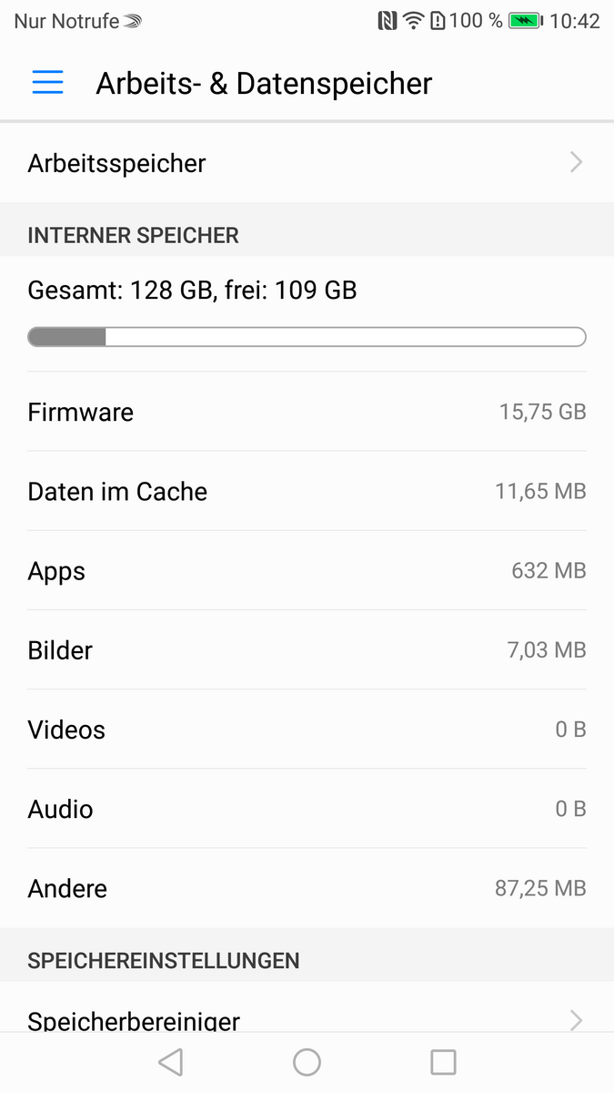 Der schon beim P10 zu beobachtende enorme Speicherverbrauch, den EMUI 5.1 inklusive seiner Softwarebeigaben an den Tag legen, hat sich beim P10 Plus noch etwas gesteigert. Von den nominell 128 GB Speicher sind im werksfrischen Zustand nur noch 109 GB übrig. Alleine die Firmware zweigt sich schon satte 16 GB ab. Hinzu kommen dann noch die vorinstallierten Apps, die ebenfalls ihren Anteil vom Speicher fordern.
