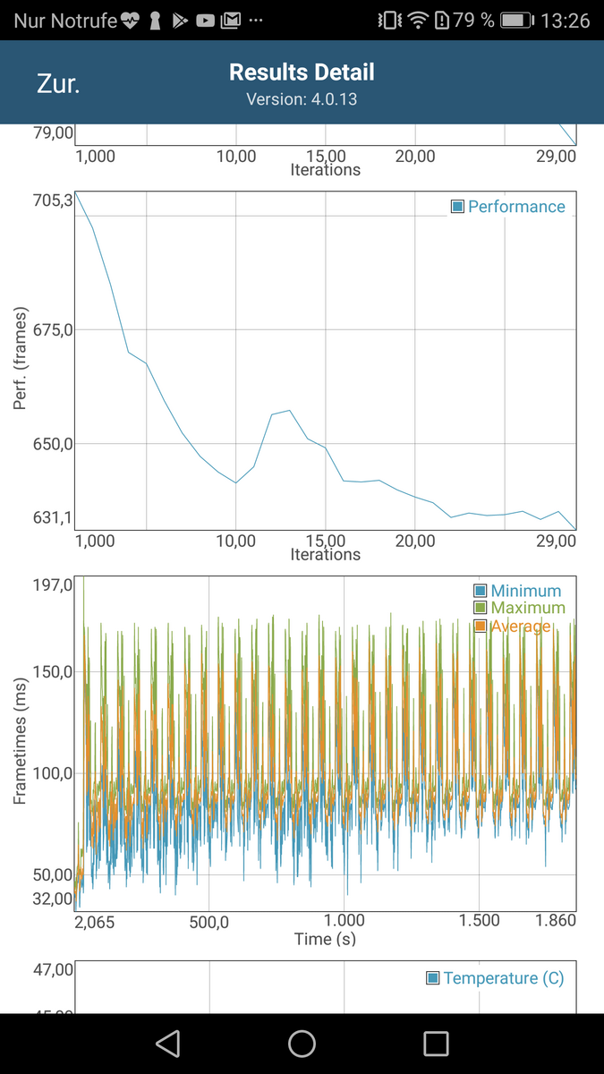Der Akkutest von GFXBench zeigt, dass es auch dem P10 Plus irgendwann zu heiß wird. Sowohl beim T-Rex- und dem anspruchsvolleren Manhattan-Testszenario, das jeweils 30-mal gerendert wird, fällt die Performance bereits nach wenigen Durchläufen ab. Beim T-Rex-Benchmark (OpenGL ES 2.0) beträgt der Leistungsverlust moderate 7 Prozent, beim Manhattan-Benchmark (OpenGL ES 3.1) fast 11 Prozent.
