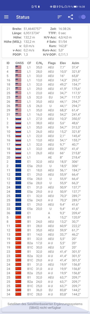 Für die Ortung nutzt das Huawei P40 Pro die Satellitensysteme GPS, Glonass, BeiDou und Galileo und unterstützt Dual-Band-GNSS. Der Satfix gelingt im Freien sehr schnell und genau, in Gebäuden dauert es länger, und auch die Genauigkeit fällt schwächer aus.