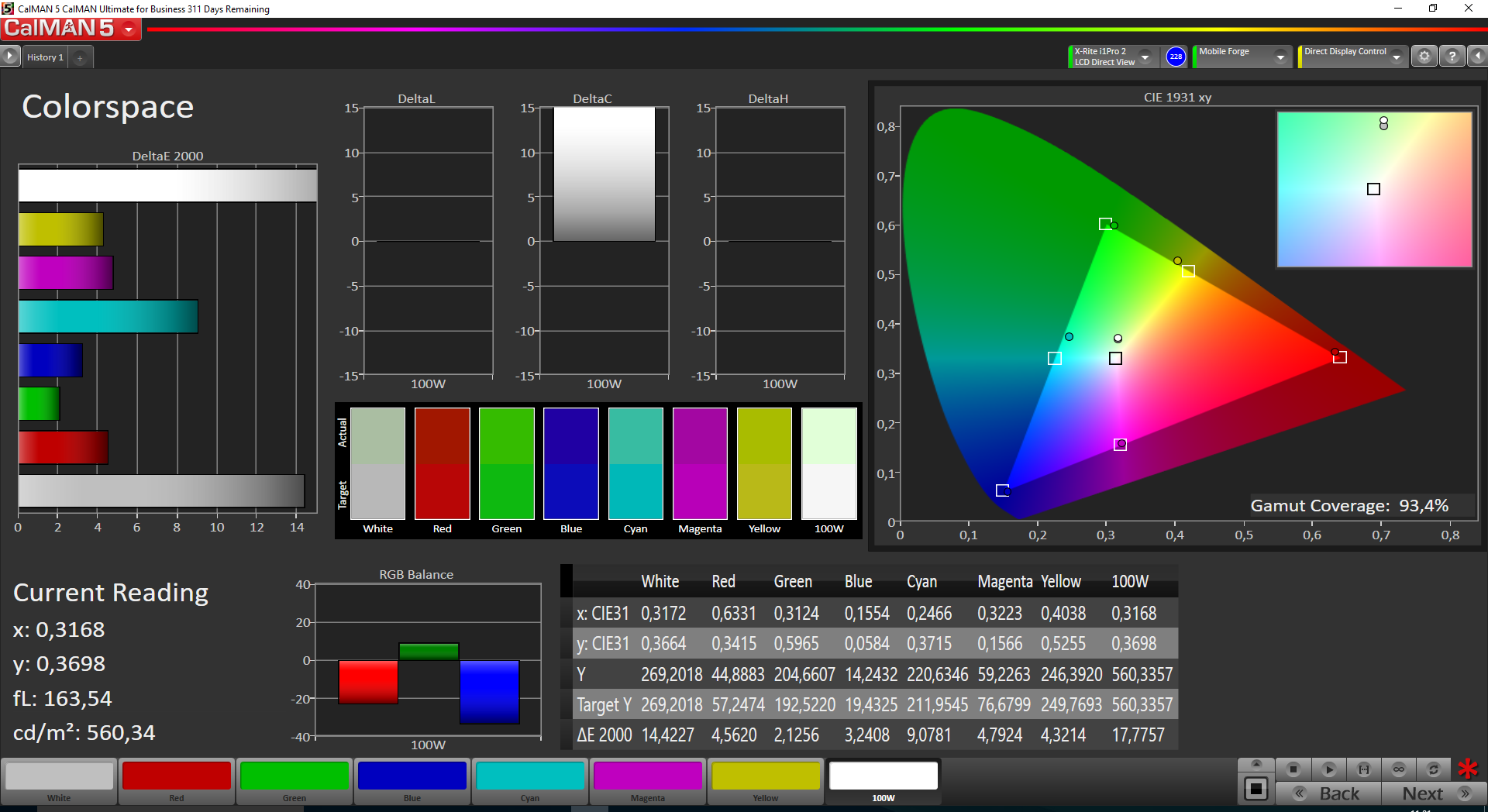 Mit der Software CalMAN und dem Spektralfotometer testen wir die Bilddarstellung bei der Werkseinstellung, sowie bei kaltem und warmen Weißabgleich. Einen Farbstich gibt es immer, der Weißabgleich verändert nur die Farbe: Bei sehr warmem Weißabgleich ist der Farbstich grün, bei sehr kalter Einstellung blau. Die Standardeinstellung bietet die geringste Abweichung der Farben im Vergleich zum Farbraum sRGB. Je nach Einstellung wird der Farbraum sRGB zu 93,3 bis 93,7 Prozent abgedeckt. Profis wird das zu wenig sein, zumal man den Farbstich nicht komplett entfernen kann. Auch normale Nutzer sollten sich auf die Farben des Bildschirms nicht zu sehr verlassen.