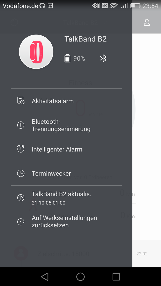 Das Herzstück des TalkBand B2 befindet sich mit der Huawei Wear App auf dem Smartphone, welche die gesammelten Daten vom Smartband ausliest und verarbeitet. Eine dauerhafte Verbindung ist dafür nicht notwendig. Außerdem lassen sich darüber Wecker konfigurieren, der Aktivitätsalarm ein- beziehungsweise ausschalten sowie die Bluetooth-Trennungserinnerung verwalten. Letztere lässt das TalkBand B2 vibrieren, wenn die Funkverbindung zum Smartphone abreißt, um zu verhindern, das eigene Smartphone zu vergessen. Der Aktivitätsalarm erinnert in frei definierbaren Abständen, sich zu bewegen.