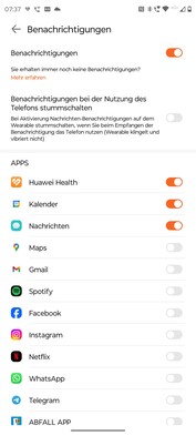 Benachrichtigungen zeigt die Huawei-Smartwatch zuverlässig an. Sie erscheinen als Pop-Up und können anschließend nach App sortiert im Benachrichtigungsmenü abgerufen werden. Die Watch Fit 3 kann auch Emojis darstellen, Bilder jedoch nicht.
