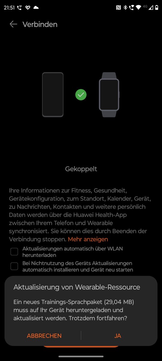 Für die Einrichtung der Watch Fit 3 wird die Huawei-Health-App benötigt. Auf der Verpackung der Smartwatch ist ein QR-Code abgedruckt, wird dieser eingescannt, kann die APK der App heruntergeladen werden.