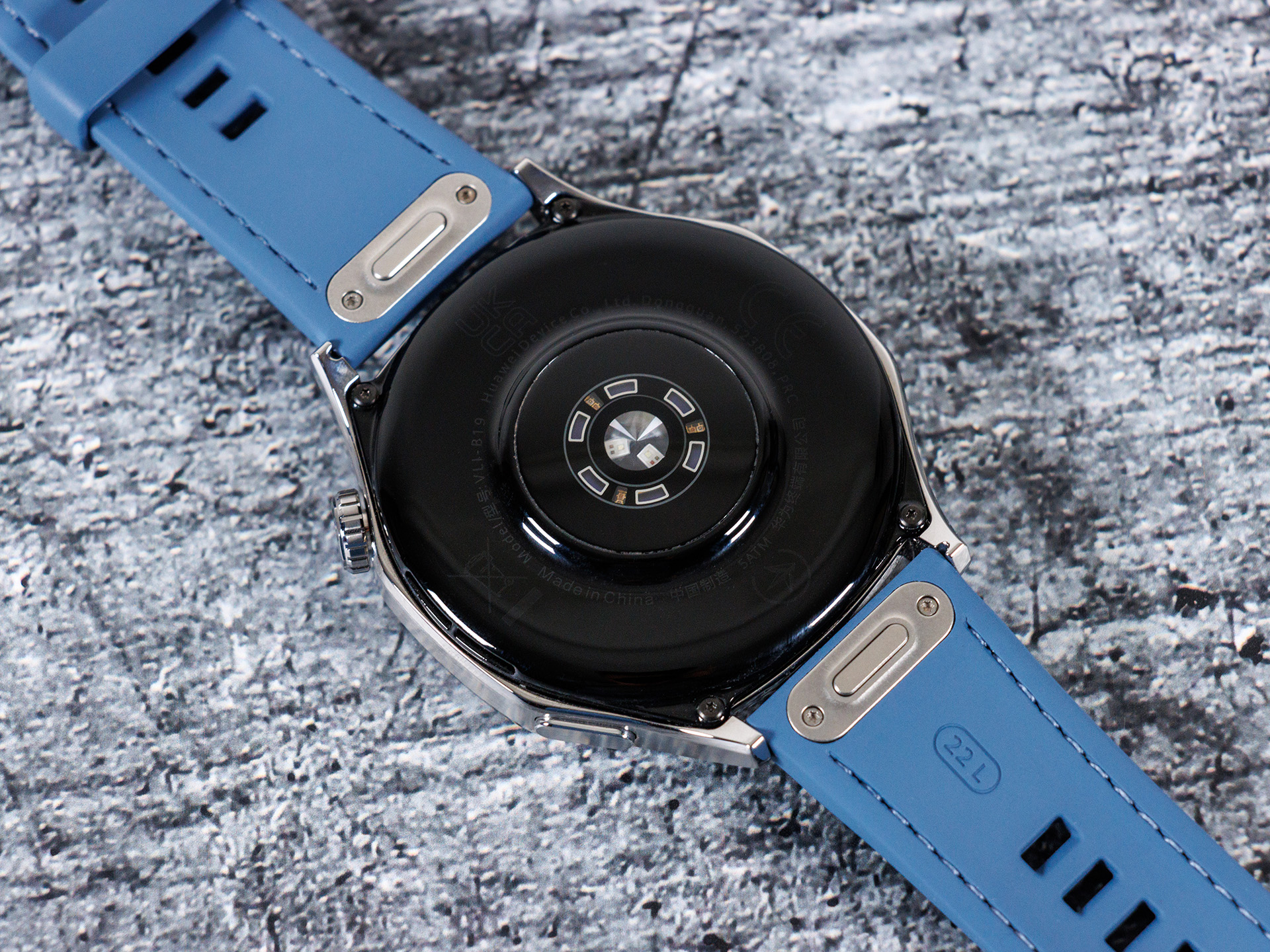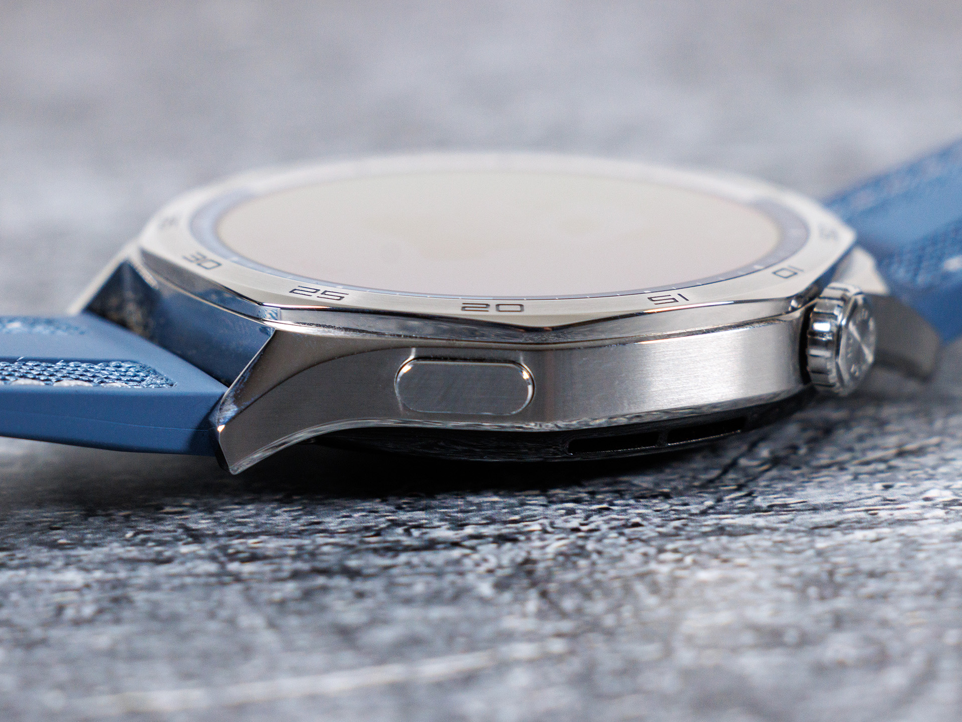 Auf der rechten Seite befindet sich eine dreh- und drückbare Kröne, die ebenfalls aus Edelstahl besteht. Darunter eine zusätzliche Taste, deren Belegung sich einstellen lässt und standardmäßig die Trainingsübersicht startet. Die Unterseite besteht aus einem Polymer-Verbundwerkstoff. Die Watch GT 5 ist bis zu 5 ATM wasserdicht und darüber hinaus IP69K zertifiziert. Das heißt, sie ist sowohl staubdicht als auch wasserdicht, inklusive den Schutz vor Hochdruck- und Dampfstrahlreinigung. Dennoch bleibt die erweitere Tauchfunktion im Meer (bis zu 40 m) dem Pro-Modell vorbehalten. Gleiches gilt für den professionellen Golf-Modus.