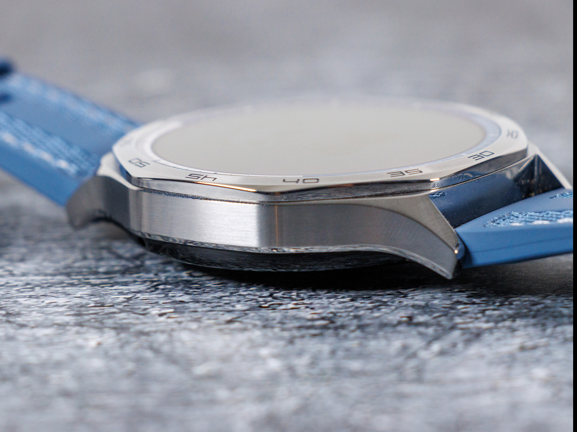 Anders als noch bei der Watch GT 4 ist das Edelstahlgehäuse der Huawei Watch GT 5 nicht mehr mit einer Titanlegierung ummantelt, sondern setzt stattdessen auf eine Mischung aus matten und glänzenden Edelstahloberflächen. Die Verarbeitung ist sehr gut und hinterlässt einen hochwertigen Eindruck. Das nicht näher spezifizierte Displayglas schließt bündig mit der Lünette ab. Diese ist nicht drehbar und hat auch keinerlei Sensoren integriert.
