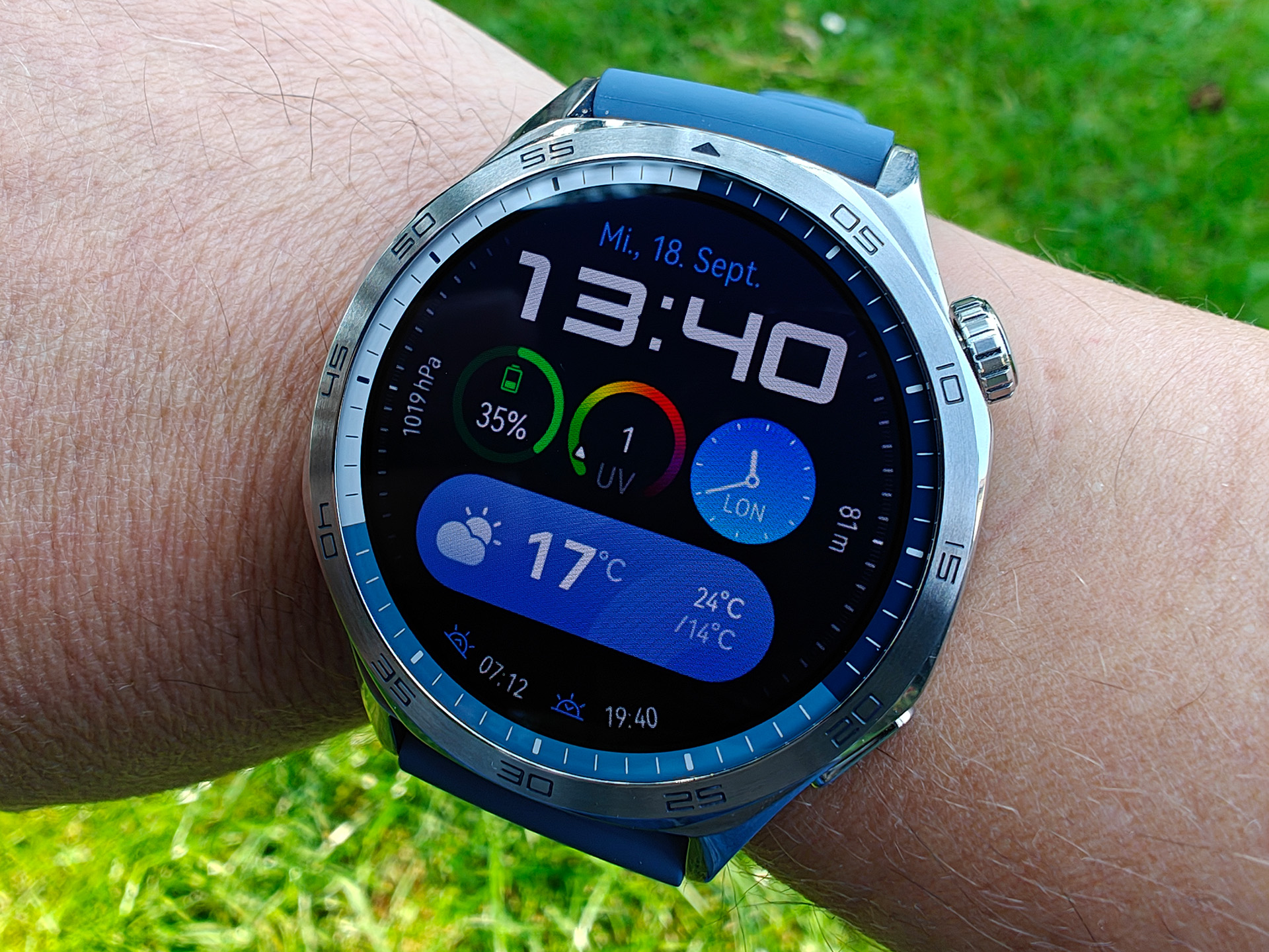 Neu in der Huawei Watch GT 5 sind unter anderem der neue TrueSense-Sensor, das hellere Display sowie eine verbesserte IP-Zertifizierung. Bei unserem Testmodell handelt es sich um die 46-mm-Variante mit blauem Armband.