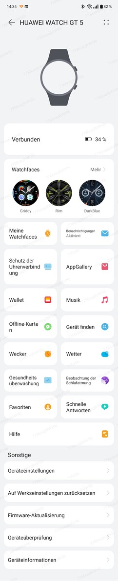 Die Wischgesten auf dem Touchscreen sind funktional: Ein Wisch von der oberen Kante zieht das Schnellzugriffmenü nach unten, ein Wischen von links führt die Nutzerin zurück zur vorherigen Ansicht, oder von der Startseite aus zu einer kleinen Shortcut-Seite, die eine Wetter-Kachel und die Musik-Steuerung bereithält. Von rechts lässt sich bequem durch die Widgets navigieren, welche sich in der App sortieren, entfernen oder ergänzen lassen. Von unten werden die Benachrichtigungen eingeblendet, deren Status nicht synchronisiert wird. Werden die Nachrichten also auf dem Smartphone gelesen, bleibt die Benachrichtigung auf der Watch GT 5 bestehen. Andersherum verhält es sich genauso.