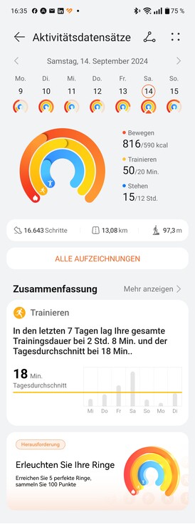 Für das alltägliche Aktivitätstracking offeriert Huawei zwei Möglichkeiten, Aktivitätsziele zu setzen: Das ist zum einen über die klassischen drei Ringe, welche Ziele für Kalorien, das Stehen und Trainieren erfassen, und zum anderen ein Health-Kleeblatt. Beim Kleeblatt werden mehrere Bereiche getrennt analysiert: Schlaf, Schritte und Stimmung.