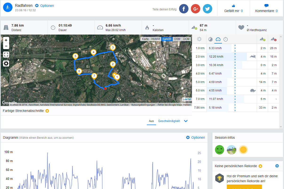 Für praxisnähere Aussagen über die Qualität der Ortung nehmen wir das Smartphone mit auf einen Ausflug mit dem Fahrrad. Ebenfalls dabei: Das Profi-Navi Garmin Edge 500. Die gemessene Wegstrecke weicht um 200 Meter voneinander ab, was auf 8 Kilometer spürbar, aber noch akzeptabel ist. Man merkt bei der Betrachtung der Screenshots deutlich, dass das Huawei Y5 II immer relativ oft einfach gerade Strecken zwischen zwei Punkten zieht, wenn die Ortung dazwischen nicht möglich war. Hier ist das Profi-Navi spürbar genauer. Für die gelegentliche Navigation dürfte die Genauigkeit ausreichen. Wer dieses Feature oft nutzt, der sollte sich vielleicht nach einem anderen Gerät umsehen.