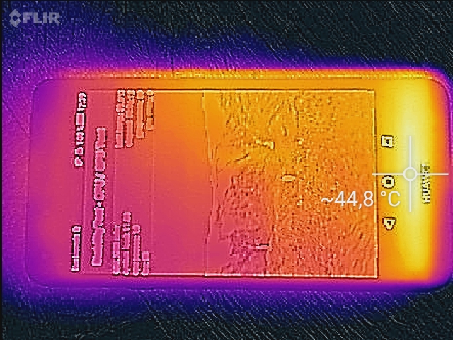 Eine recht hohe Erwärmung unter Last kommt beim Huawei Y5 II zustande. Bis zu 42,5 Grad Celsius können es an der Vorderseite werden. Das ist schon durchaus spürbar und unter Umständen auch unangenehm. An der Rückseite bleibt das Gerät zwar etwas kühler, erwärmt sich aber immer noch stark.