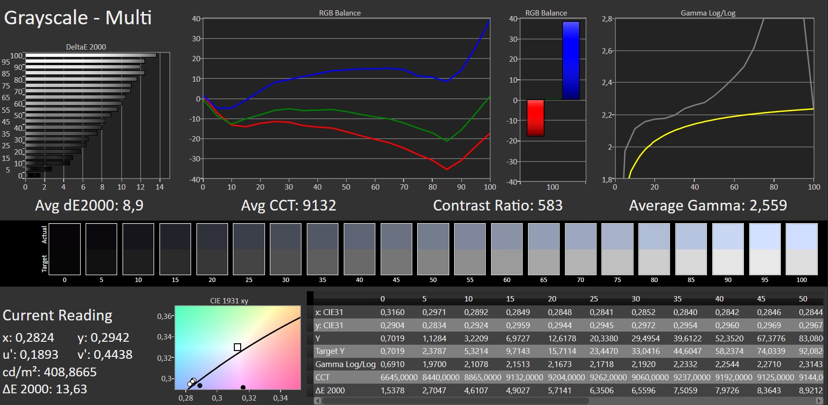 Für genauere Aussagen über die Farbdarstellung nutzen wir ein Spektralfotometer und die Software CalMAN. In den Standardeinstellungen des Bildschirms ist hier ein deutlicher Blaustich sichtbar. In den Einstellungen kann man den Weißabgleich anpassen, in drei vorgegebenen Stufen oder komplett manuell. Die Vorgabe "Kalt" erzeugt einen noch heftigeren Blaustich und auch die Farbwerte weichen stärker vom Referenzwert ab. Im Modus "Warm" ist die Farbabweichung ebenfalls höher als in den Standard-Einstellungen und es gesellt sich ein Grünstich zu den Graustufen. Per manueller Einstellung suchen wir einen optimalen Weißabgleich, die Einstellungen finden Sie rechts im Screenshot. Dort wird Weiß tatsächlich recht exakt dargestellt, helle Graustufen allerdings zu dunkel. Auch die Farben werden etwas exakter dargestellt als in den Standard-Einstellungen.