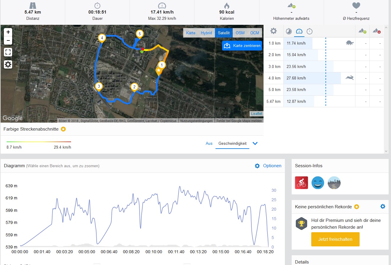 In unserem Detailtest fahren wir mit dem Mountainbike eine Strecke ab und nehmen dabei das Testgerät, sowie ein Profi-Navi Garmin Edge 500 mit. Das Huawei Y6 2018 schlägt sich hierbei recht wacker, sogar bei der recht komplizierten Strecke über die Brücke platziert uns das Smartphone einigermaßen exakt, bei der Strecke durch eine kleine Anpflanzung vollzieht das Garmin Edge 500 aber unsere Strecke wesentlich genauer nach. Insgesamt merkt man den Unterschied zwischen dem Profi-Navi und dem Smartphone deutlich, für ein so günstiges Gerät sind wir aber mit der Ortung zufrieden.