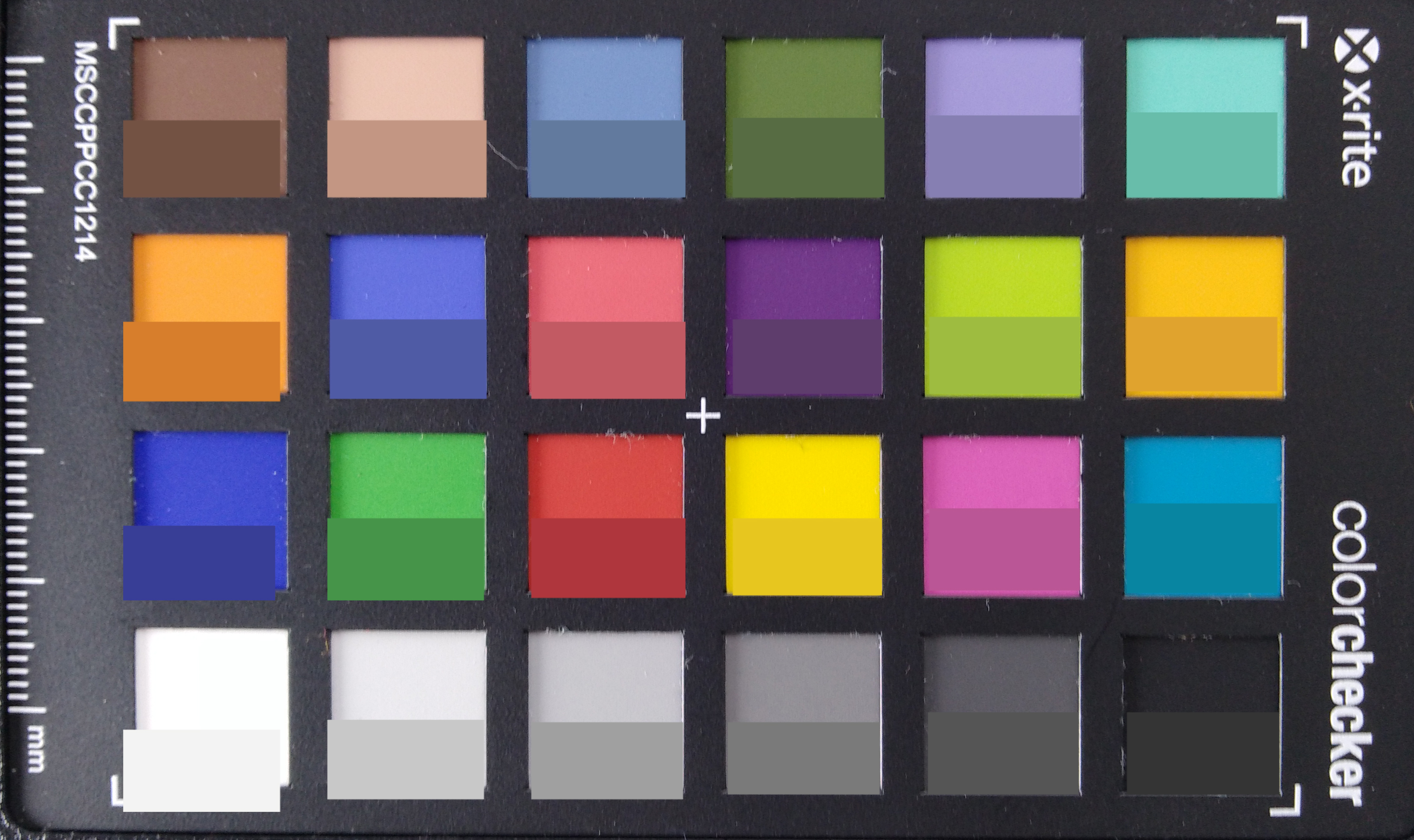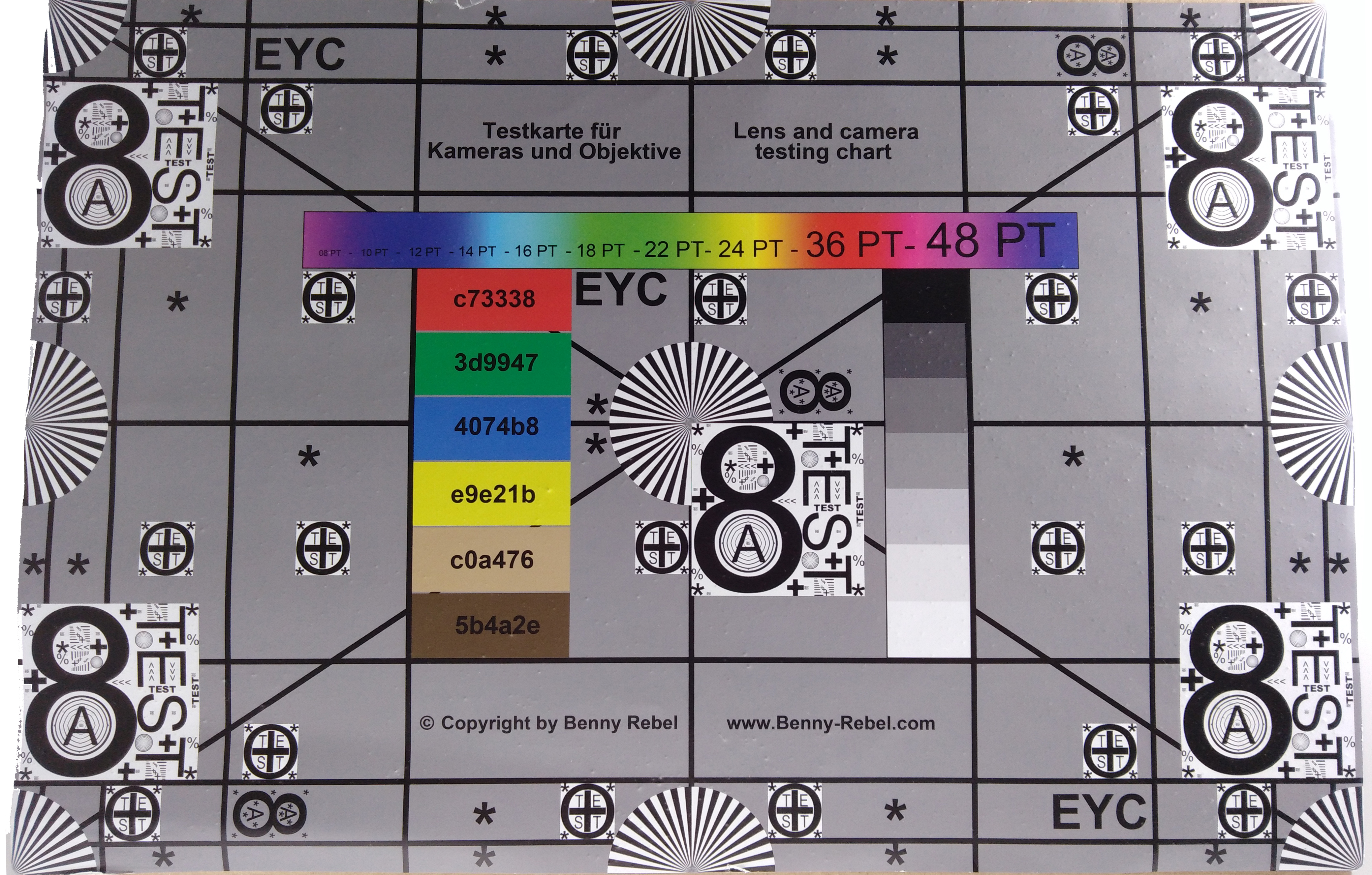 Szene 1Szene 2Szene 3Unter kontrollierten Lichtbedingungen fotografieren wir unser Testchart und die Farbkontrolltafel von XRite in unserem Testlabor. Hierbei wird eine einigermaßen scharfe Darstellung sichtbar, Farbflächen wirken nur leicht fleckig. Text vor farbigem Hintergrund wird ebenfalls recht scharf wiedergegeben, mit kleieren Schwächen bei gelbem Hintergrund. Zum Rand hin nimmt die Schärfe allenfalls minimal ab.