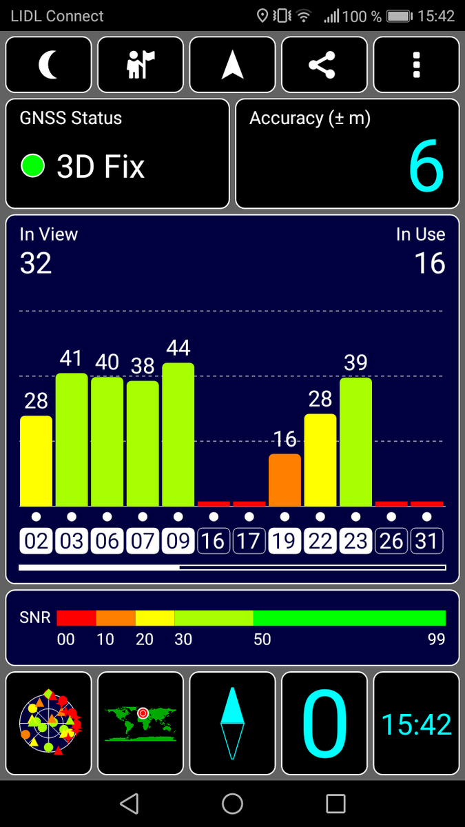 Die Positionsbestimmung kann mittels dem Satellitensystem GPS, BeiDou oder GLONASS durchgeführt werden. Der Satfix erfolgt im Freien sehr schnell und auf 6 Meter genau. In einem Gebäude kann dagegen keine dauerhafte Verbindung mit einem Satelliten hergestellt werden.