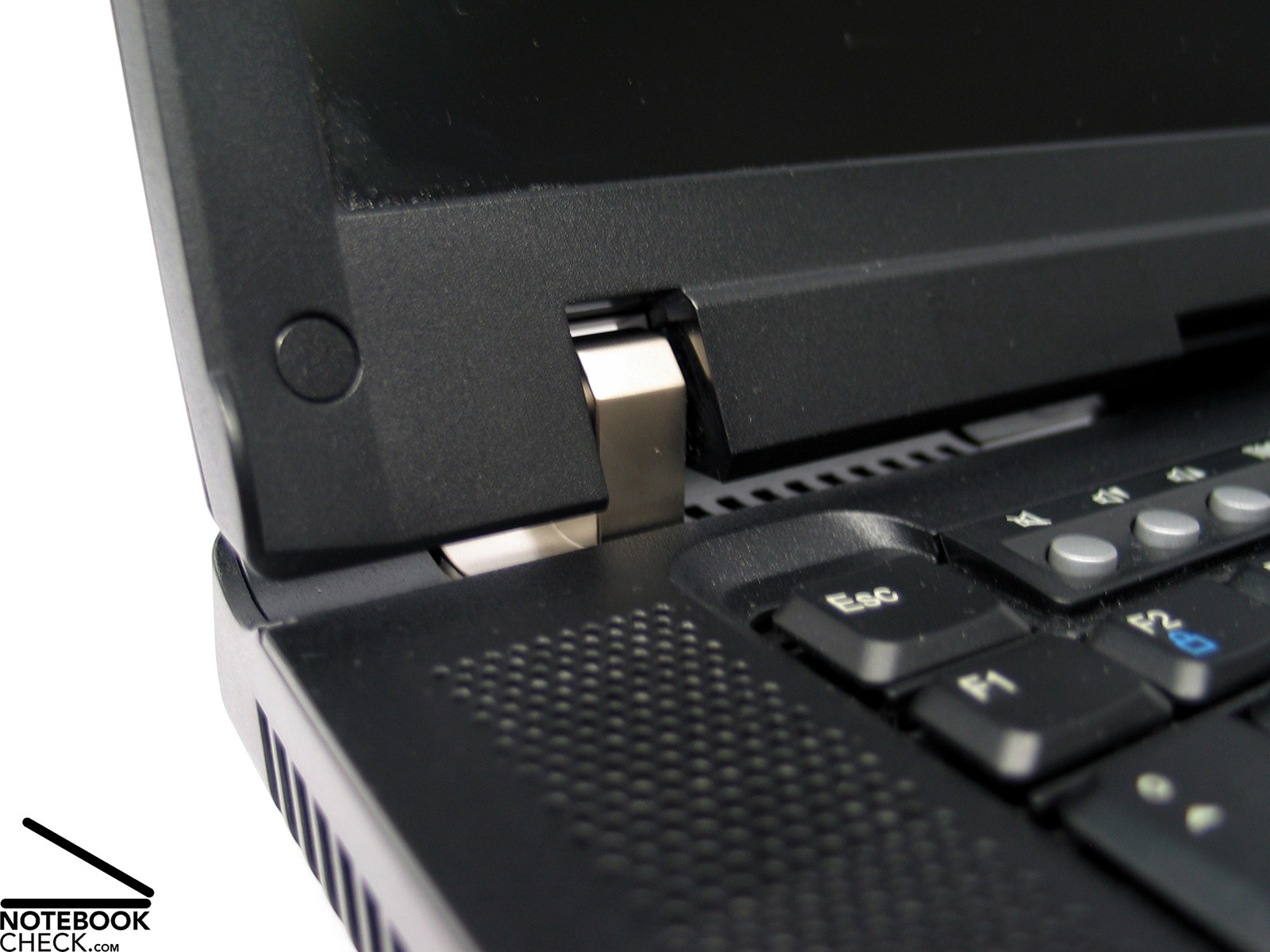 Die Scharniere sind im typischen IBM Stil ausgeführt. Geometrisch - Kantig - Metallisch. Genau so wie sie aussehen funktionieren sie auch. Das Display lässt sich präzise im Neigungswinkel verstellen und die Scharniere sollten auch nach mehreren Jahren noch in der Lage sein den Bildschirm fest in Position zu halten. Gesichert wird das Display mittels eines Doppelhakensystems. Im geschlossenen Zustand lässt sich aber trotzdem ein leichtes Wackeln des Displays feststellen.