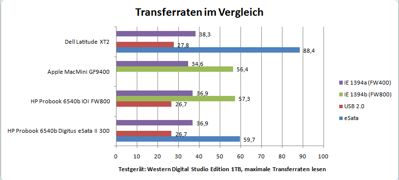 Die Installation verläuft unter Windows 7 Professional 64 Bit nach dem Einstecken automatisch ab und die externe Festplatte kann ohne Neustart sofort verwendet werden. Die Transferraten (lesen) erreichen bei unserem HP Probook 6540b maximal 57,3 MB/s. Damit ist man deutlich schneller unterwegs als mit USB 2.0 und FW400 (IEEE1394a), liegt aber hinter eSATA und USB 3.0 auch genauso deutlich zurück. Mit Mac Os X konnten wir mangels Testgerät keine Messung durchführen, die Übertragungsraten dürften sich aber in einem ähnlichen Rahmen bewegen.