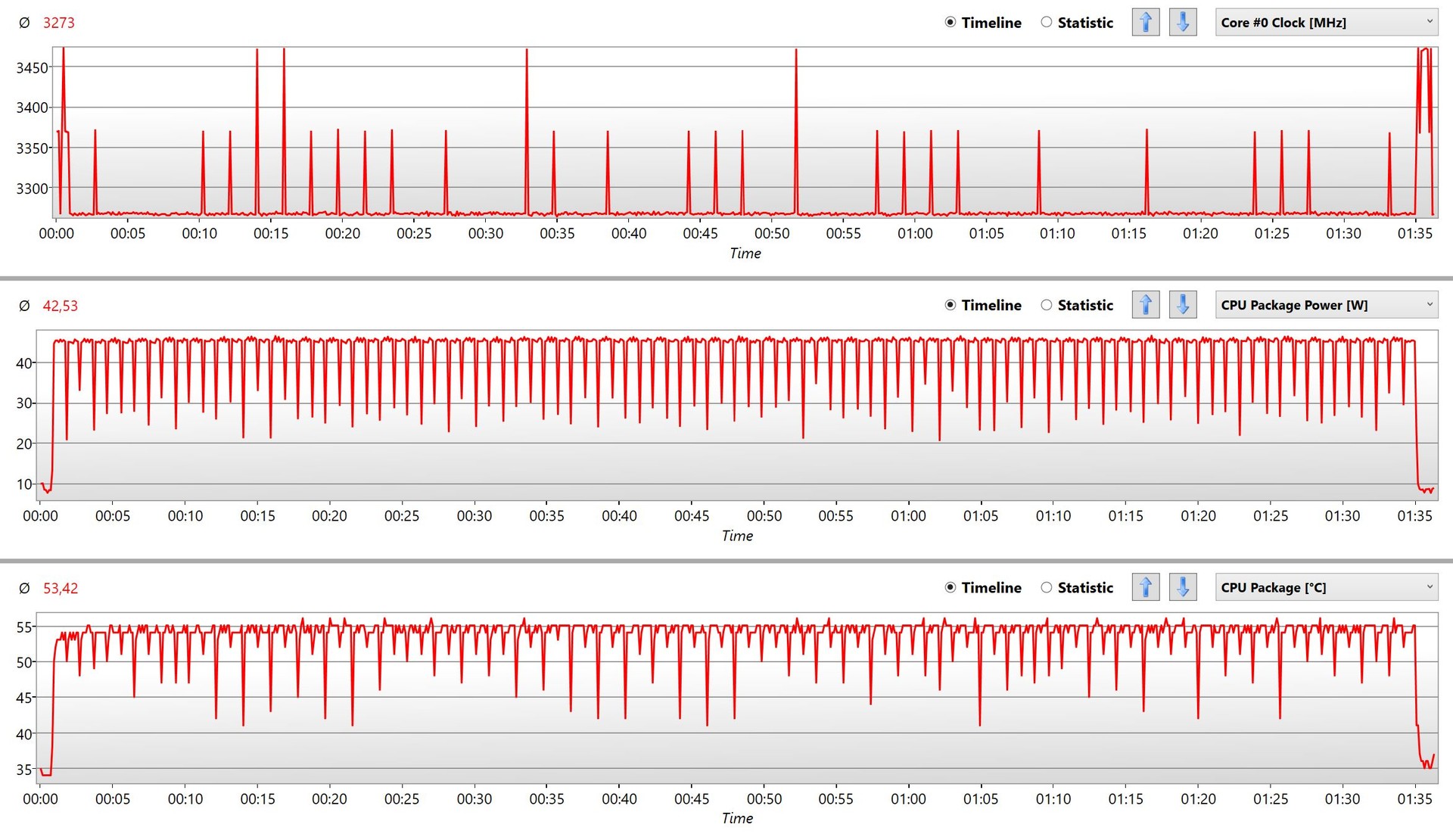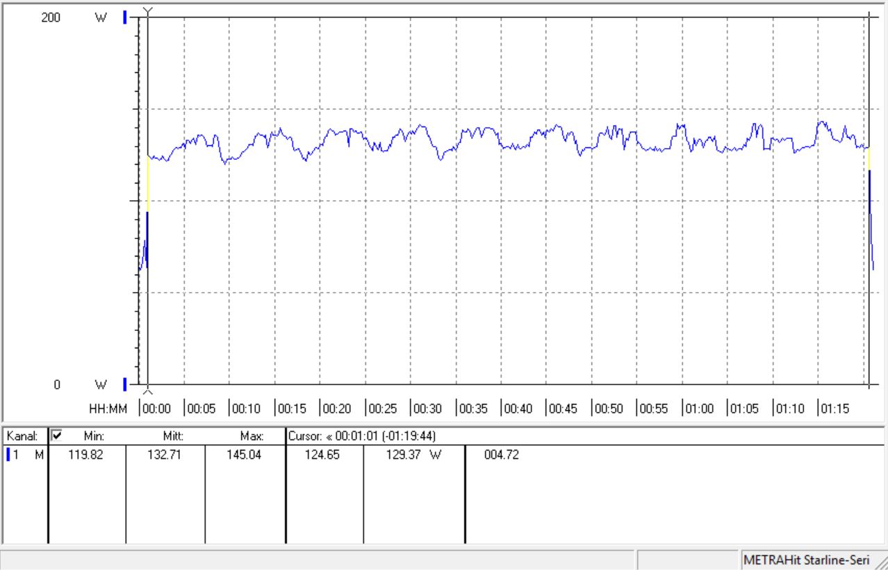 Mit der Cinebench-R15-Multi-Schleife ermitteln wir das Verhalten des Prozessors bei anhaltender Belastung. Während des Lasttests protokollierten wir einen durchschnittlichen Strombedarf von 42,5 Watt. Die Taktfrequenz lag im Durchschnitt bei 3,2 GHz was sich auch mit den Herstellerangaben deckt. Die Temperatur des Intel Core i5-8500T ist mit unkritischen 53,4 °C sogar recht kühl, was aufgrund der AIO von Raijintek auch nicht anders zu erwarten war. Die Ergebnisse liegen im Durchschnitt bei 760 Punkten. Dieses etwas geringere Ergebnis ist auf das Erstellen der Log-Datei während des Tests zurückzuführen.