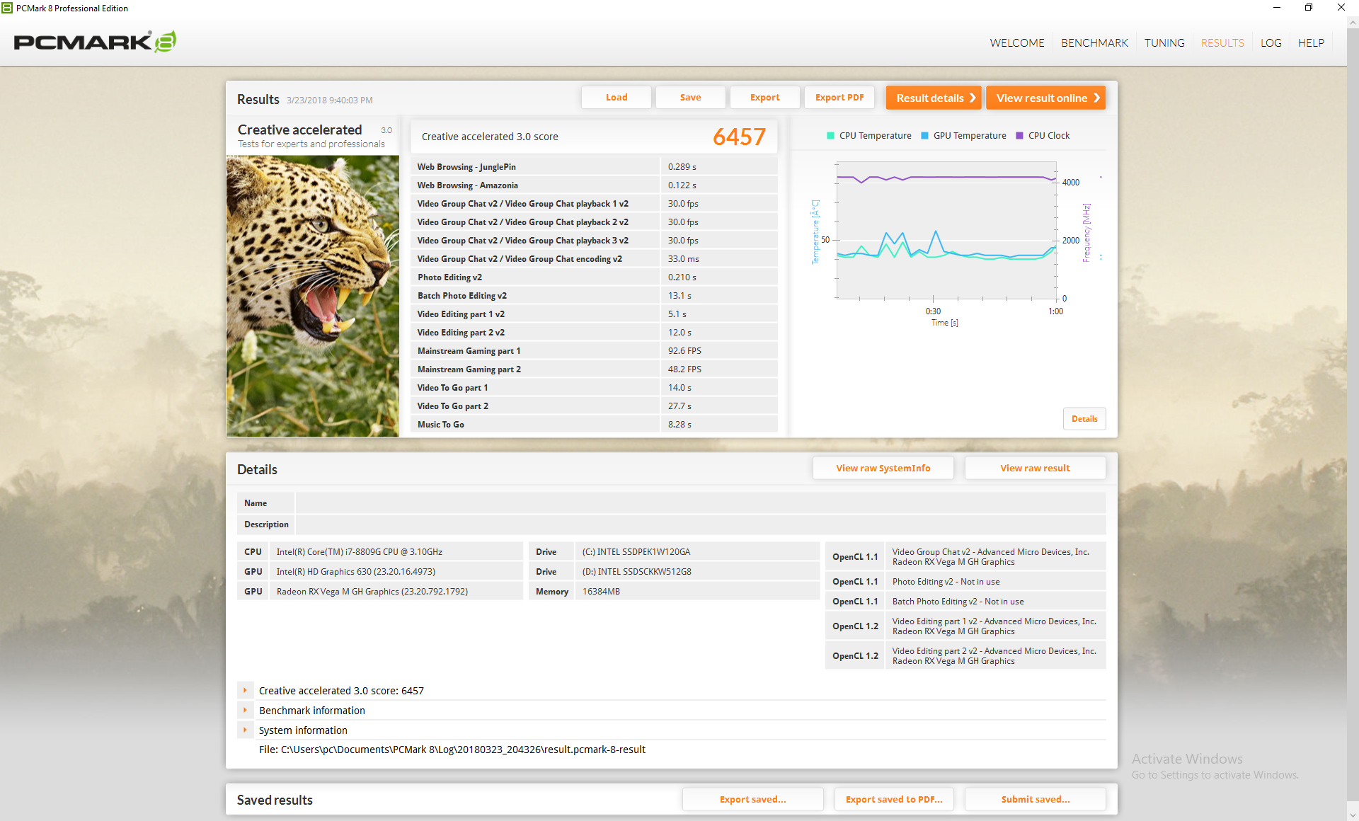 Die PCMark-Ergebnisse gehören zu den höchsten in unserer Datenbank und liegen auf dem Niveau von einigen GTX-1080-Laptops inklusive dem wuchtigen HP Omen X 17 oder dem Acer Predator Triton 700. Der Intel NUC kann es natürlich nicht mit der Grafikleistung dieser Systeme aufnehmen, doch hier spielen die anderen Komponenten wie HBM2, Optane SSD und Kaby Lake-G eine Rolle. Man bekommt hier einen sehr leistungsfähigen und reaktionsschnellen PC, und während des Tests konnten wir keine Probleme feststellen.