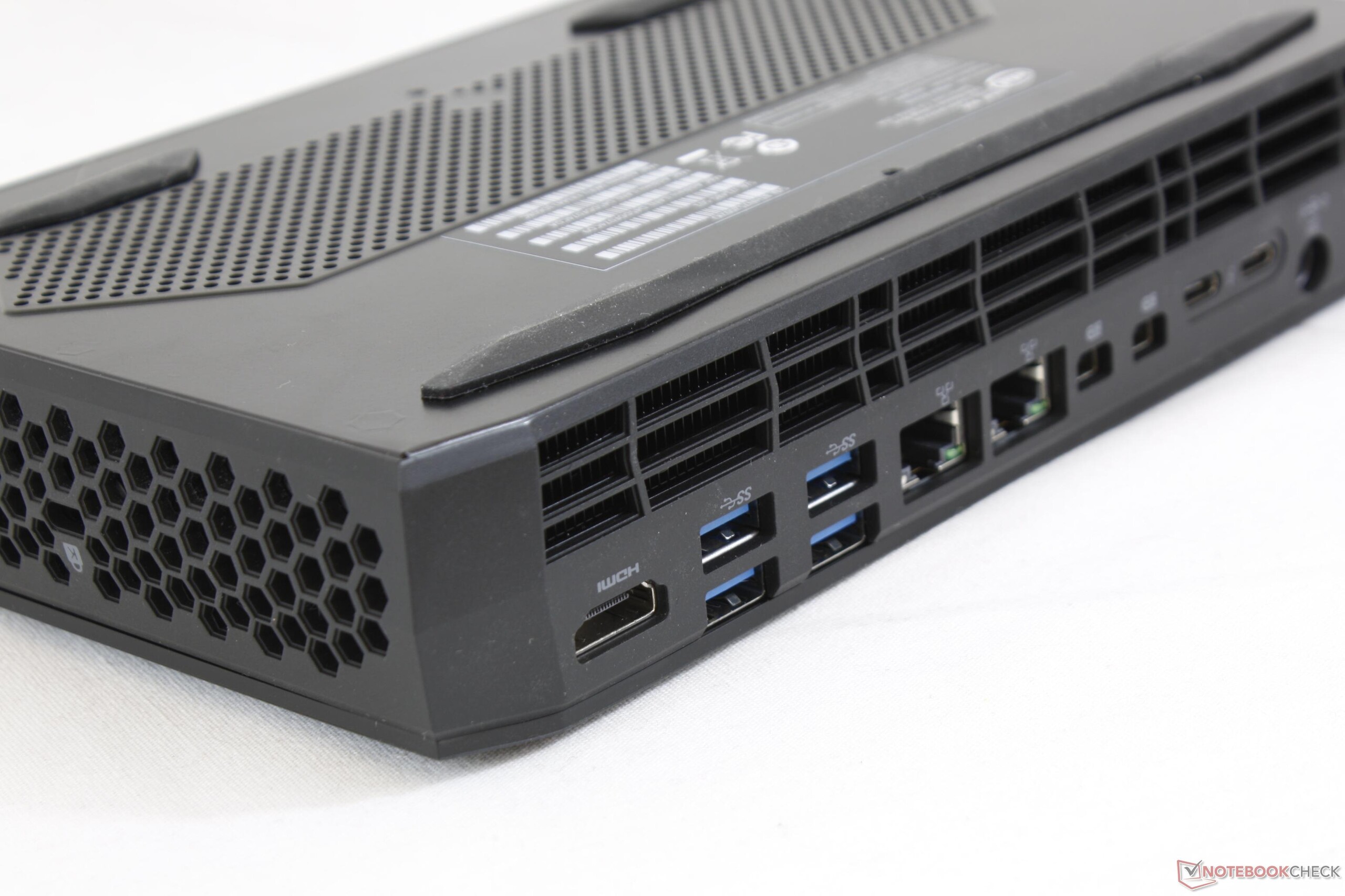 Intel nutzt das größere Gehäuse aus und verbaut eine ganze Reihe von Anschlüssen, und fast alle Stecker sind doppelt vorhanden. Dazu gehören auch Thunderbolt 3, Gigabit-Ethernet, Mini-DisplayPort, HDMI und USB. Damit übertrifft der NUC andere SFF-Systeme (Small Form Factor) wie das MSI Trident 3 oder Asus GR8 II. Die Abstände zwischen den einzelnen Anschlüssen sind recht gleichmäßig, auf der Rückseite kann es aber ein wenig eng werden. Die Vega-M-GPU kann bis zu 6 unabhängige 4K-Displays gleichzeitig ansteuern, was aber nur für das teurere Modell gilt. Wir hätten uns noch einen HDMI-Eingang gewünscht, um den NUC auch als Heimkinosystem zu nutzen.