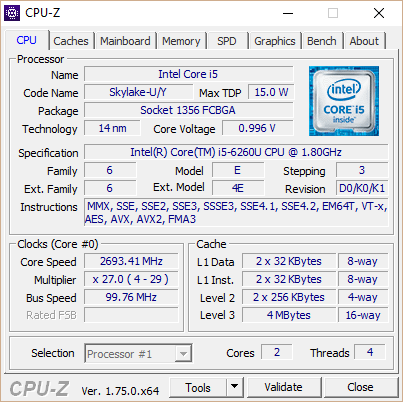 Wir starten aber zunächst mit dem Prozessor im Inneren des NUC, einem Intel-Skylake-SoC. Es handelt sich um einen Dual-Core von Intel mit der Bezeichnung Core i5-6260U und einer TDP von 15 Watt. Der Basistakt liegt bei 1,8 GHz und ein Kern kann via Turbo-Boost maximal 2,9 GHz erreichen. Hier gibt es jedoch thermische Begrenzungen, auf die wir gleich noch genauer eingehen werden.
