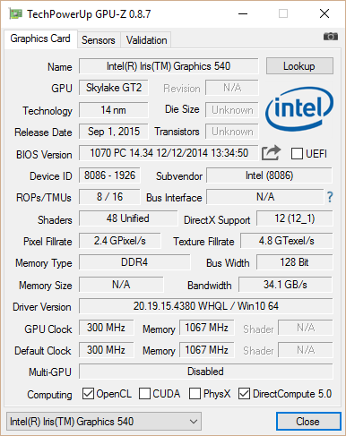 Ein besonderes Ausstattungsmerkmal dieses Core-i5-Prozessors ist die Intel Iris Graphics 540. Mit 48 Execution Units ist diese GPU deutlich leistungsstärker als die normalen HD-Graphics-Chips. Die HD 530 hat beispielsweise lediglich 24 EUs. Der maximale Kerntakt liegt bei 1.050 MHz. Die GPU beinhaltet auch einen Hardware-Decoder für HEVC-Videos und neue Intel Quick-Sync-Modi, die zu einer geringeren Auslastung führen sollen. Im 3DMark 11 liegt die GPU 3 % vor der Nvidia GeForce 840M, aber 4 % hinter der GeForce 930M. Wir haben zudem die Ergebnisse des alten NUC 5i5RYH aufgeführt und die Verbesserung ist mit 83 % zu Gunsten der Iris-540-GPU enorm.