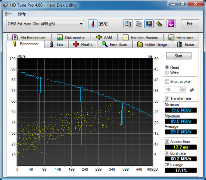 Die Leistungsfähigkeit der Festplatte wird durch die USB 3.0 Schnittstelle nicht limitiert und kann somit voll abgeschöpft werden. Wir haben mit NEC- (Renesas) und Etron-Controller an den Gegenstellen getestet. Mit knapp 90 MB/s im Maximum und durchschnittlich knapp 70 MB/s beim Lesen liegt die Samsung HM500JI etwa auf dem Niveau der Konkurrenz. Noch schnellere Modelle, wie etwa Toshibas MK5065GSX erreichen ca. 10 MB/s mehr. Beim sequentiellen Lesen und Schreiben wird die 90-MB/s-Marke gerissen und die Zugriffszeit liegt mit 17,7 ms im für Festplatten üblichen Bereich. Siehe zum Vergleich auch unsere umfangreiche HDD-Benchmarkliste.