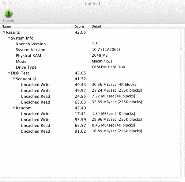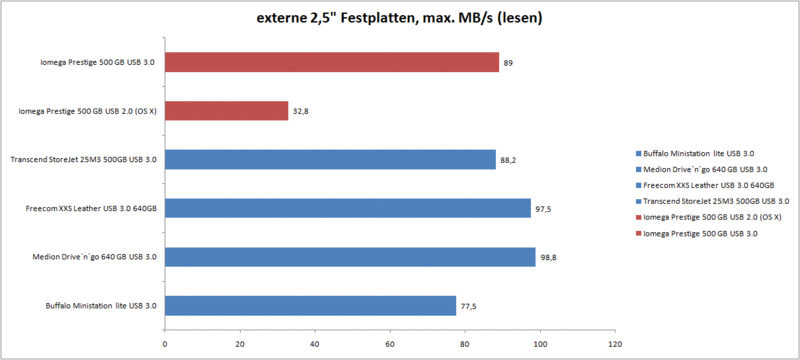 Um die Iomega Prestige am Mac nutzen zu können, muss die NTFS vorformatierte Festplatte ins HFS oder FAT Format umformatiert werden. Wir haben FAT32 gewählt, da dies für ein USB-3.0-Laufwerk die wahrscheinlichere Variante sein wird, um diese am Mac als auch am PC einsetzen zu können. Hier haben wir am aktuellen Mac mini unter OS X Lion knapp 33 MB/s beim Lesen und knapp 30 MB/s beim Schreiben erreicht. Das sind für USB 2.0 übliche Werte und reichen zumindest für den gelegentlichen Datenaustausch zwischen den „Welten“ aus.