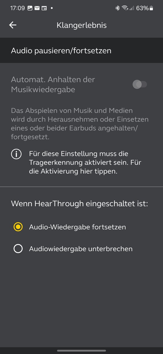 Ebenso ist eine Trageerkennung an Bord, welche die Medienwiedergabe automatisch stoppt, wenn einer oder beide Ohrhörer aus dem Ohr entnommen wird. Außerdem können Anrufe automatisch angenommen werden, sobald ein Earbud eingesetzt wird. Die Funktionen lassen sich aber auch nochmal getrennt voneinander ein- beziehungsweise ausschalten, sodass die Trageerkennung beispielsweise nur für die Medienwiedergabe nutzbar ist.