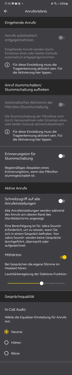 Über die App Jabra Sound+, welche kostenlos im App Store und im Play Store heruntergeladen werden kann, können nicht nur Firmware-Updates eingespielt werden, sondern es lassen sich hier auch Funktionen wie die aktive Geräuschunterdrückung (ANC), HearThrough oder Musik-Equalizer konfigurieren. Optional steht auch Spotify Tab zur Verfügung.