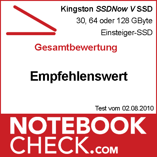 Mit High-End-SSDs von Runcore oder OCZ (Vertex 2, Agility 2) kann und soll das Laufwerk von Kingston auch gar nicht mithalten. Die SSDNow V ist ein günstiger Performance-Boost für das Net- oder Notebook. Weitere Vorteile eines SSD, wie beispielsweise der lautlose Betrieb und die Widerstandsfähigkeit, kommen hier natürlich auch zum tragen. Aufgrund dieser Fakten stufen wir die Kingston SSDNow V „empfehlenswert“ ein.