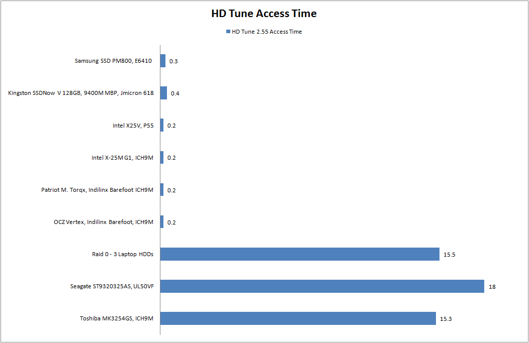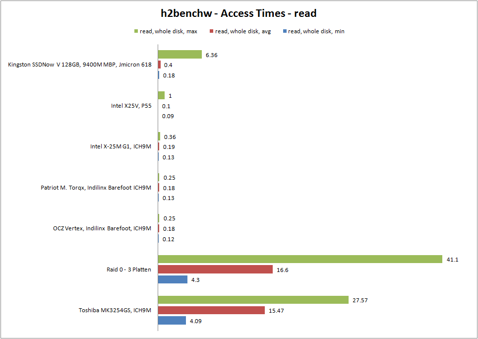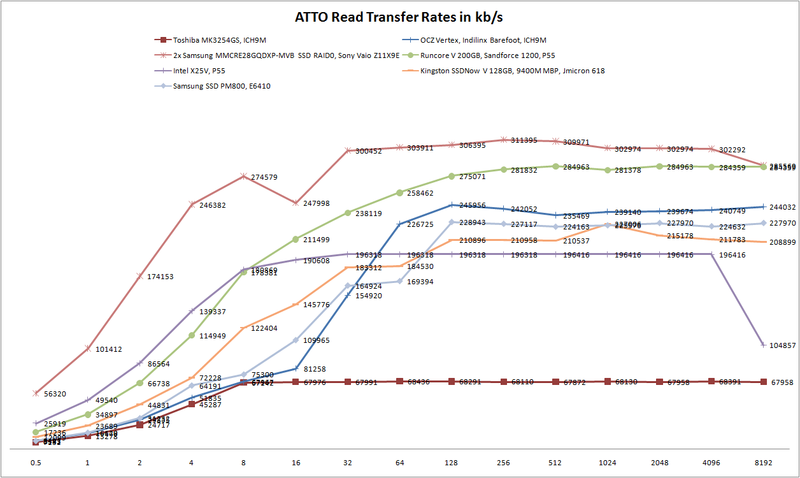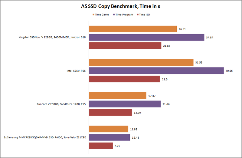 Der AS SSD Benchmark ist speziell für SSDs konzipiert und bietet eine zuverlässige Messung. Auch hier zeigen sich wieder die vergleichweise hohe Zugriffszeiten. Aufgrund der limitieren Schreibraten der Intel X25-V sichert sich die SSD von Kingston eine gute Position, wobei die Runcore V und das Raid-System von Sony deutlich schneller sind.
