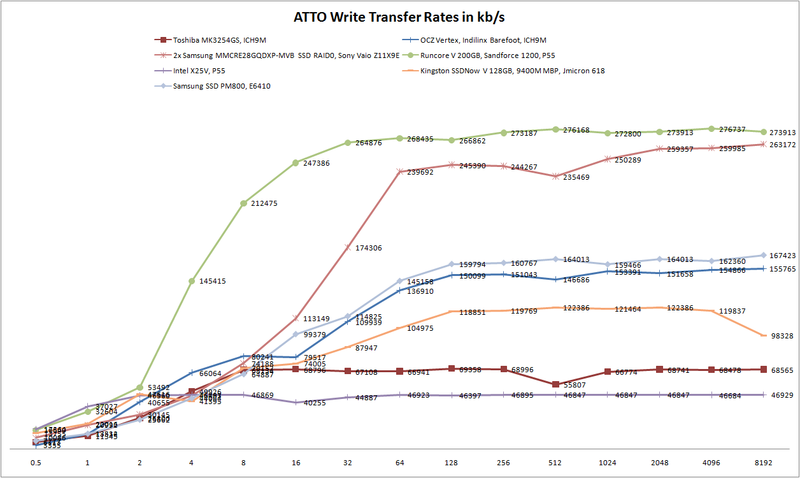 Die Leseraten liegen im mittleren Bereich mit 210 MByte im breiten Mittefeld und das Laufwerk muss sich gegenüber der schnelleren Runcore V mit Sandforce 1200-Controller oder dem Dual-SSD-System im Sony VAIO Z11X9E geschlagen geben. Insgesamt liegt die Kurve der Kingston SSDNow V immer im mittelmäßigen Bereich und Ausschläge nach Oben oder Untern gibt es fast keine. Die maximale Leseleistung bringt unser Testmodell bei einer Paketgröße von 1 GByte. Dort gibt es einen kleinen Ausreißer und der Wert liegt bei rund 223 MByte pro Sekunde. Die Festplatte von Toshiba liegt auch in diesem Test auf dem letzten Platz.