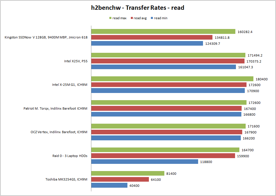 Der erste Benchmark wurde von der c’t-Redaktion auf die Beine gestellt und heißt h2benchw. Dieser ermittelt die Transferraten des SSDNow V von Kingston. Die Leseraten unter Windows liegen bei maximal 160 MByte pro Sekunde und sind damit deutlich höher als bei herkömmlichen Notebookfestplatten, wobei die kleine Intel X25-V nochmals 11 MByte mehr bietet. Eine Liga höher spielen aktuelle Laufwerke mit SandForce 1500-Controller. Ein Beispiel für ein solches Laufwerk ist die neue OCZ Vertex 2, die den Preisrahmen der Kingston SSD aber sprengt. Die durchschnittliche Leserate liegt mit 135 MByte pro Sekunde leider nur im unteren Bereich eines SSD, wobei die subjektive Performance unter Mac OS X und Windows 7 überzeugen kann. Der Performance-Anstieg, im Vergleich zu einer herkömmlichen HDD, fällt enorm aus.