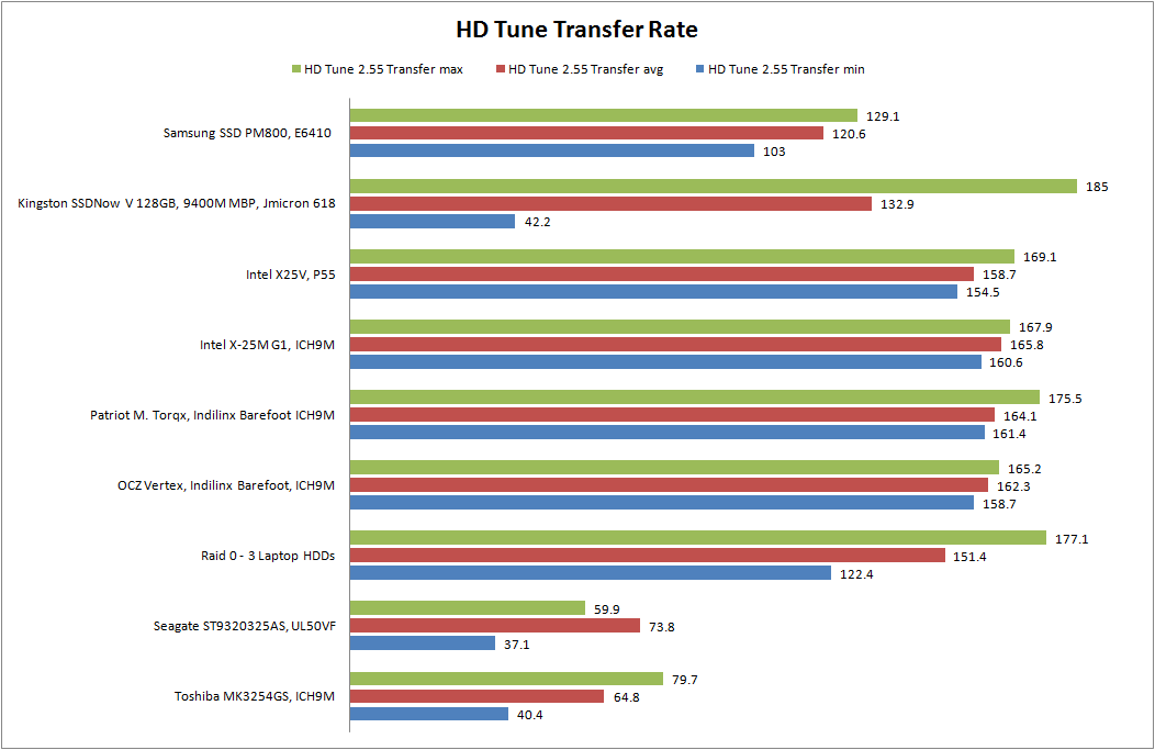 HD Tune Pro ist ein weiterer Benchmark, den wir regelmäßig in unseren Testberichten verwenden. Die Werte von HD Tune schwanken teilweise sehr stark und wir haben den Test drei mal durchlaufen lassen, wobei die maximale Übertragungsrate (Lesen) mit 185 MByte pro Sekunde erstaunlicherweise die Spitzenposition eingenommen hat. Hier können die SSDs von Intel nicht ganz mithalten. Die Zugriffszeiten sind, wie wir in der h2benchw-Analyse festgestellt haben, leicht erhöht und sind mit 0,4 Millisekunden doppelt so hoch. In diesem Test benötigen die Laufwerke von Intel nur 0,2 Millisekunden.