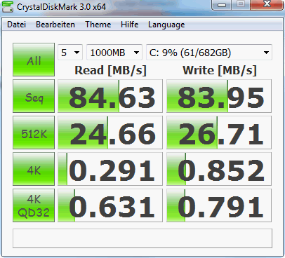 HD-Tune (73 MB/s Lesen) und Crystal Disk Mark 3.0 (84 MB/s Lesen) bescheinigen der vorliegenden Toshiba-HDD (750 GB, MK7559GSXP) keine schlechten aber für 5400 RPM noch typische Durchsätze. Mit einer 7200 RPM HDD könnten die Werte leicht höher liegen, doch der Unterschied wäre zu vernachlässigen.