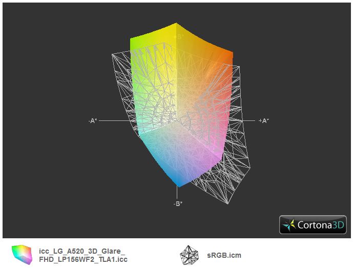 Das FHD-Panel hat einen guten Kontrast von 508:1 bieten. Das sorgt für knackige, leuchtende Farben. Der Farbraum (ICC-Profil) ist dann aber nicht ganz so gut. sRGB wird deutlich verfehlt. Bei den darstellbaren Farben sind die 3D-Konkurrenten Asus G74S und Vaio F21Z1EB (beide FHD, Nvidia 3D Vision) diesem Panel überlegen.