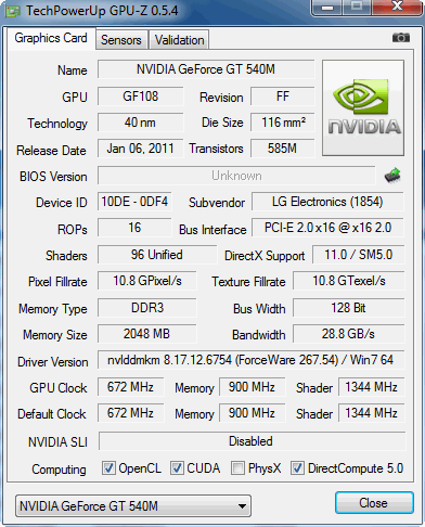 Die GeForce GT 540M (2.048 MB DDR3) gehört zu Nvidias Mittelklasse. Der Fermi-Chip unterstützt DirectX-11. Der Speicher taktet mit 672/900 MHz (Kern/Speicher) wie in den meisten Testgeräten. Der 3DMark2006 (1.280x1.024) schließt mit 8.162 Punkten ab. Eine Radeon HD 6850M (~9.700) kann das bei gleichem Speicher-Typ überbieten. Starten wir den 3DMark06 über TriDef halbiert sich der Score auf 4.180 / 3.108 (Gesamt/CPU)