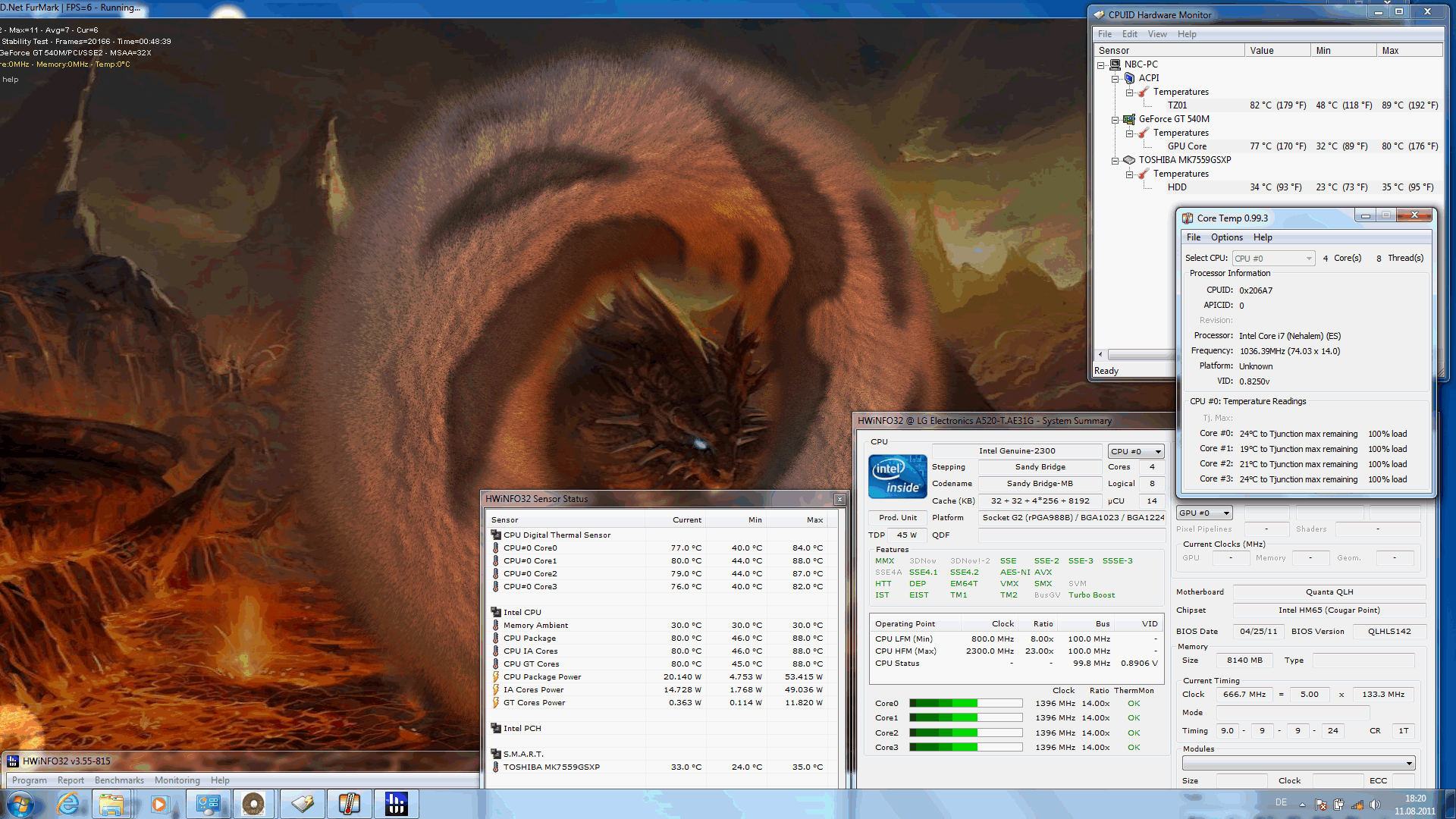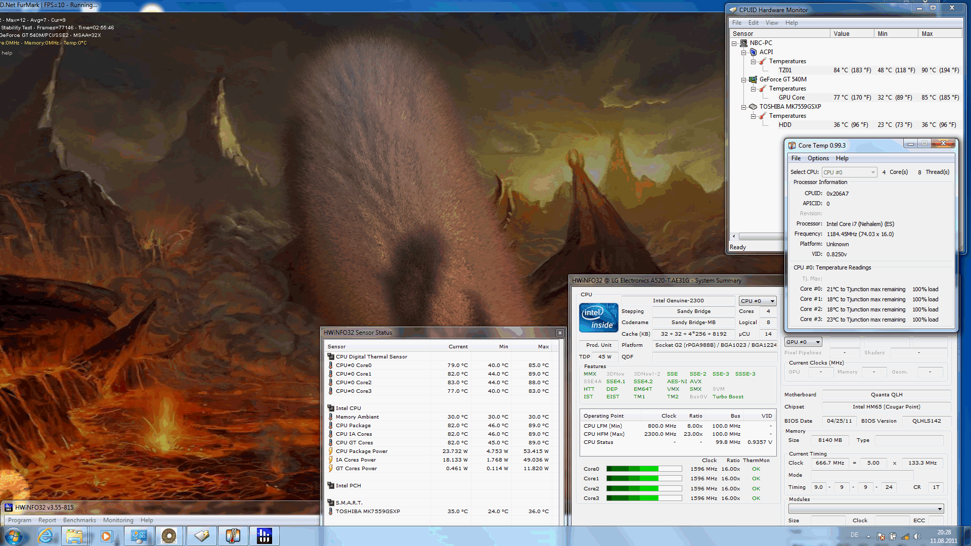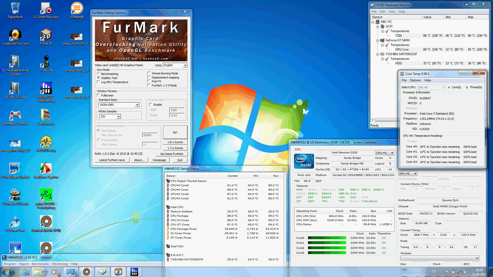 Während des mehrstündigen Stresstests (Prime95+Furmark, Siehe Screens) drosselte der CPU-Takt schnell auf 1.4 bis 1.6 GHz (Normal-Takt 2.3 GHz). Energieaufnahme des Systems: 84 Watt. Immer, wenn wir den Furmark (GPU-Last) pausierten, stieg die Taktung auf 2.3 bis 2.9 GHz (je nach Dauer der Belastung) und die Energieaufnahme lag stabil bei 81 Watt. Core Temp zeigte während des Stresstests (Prime95+Furmark) stets 25 Grad Celsius to Tjunction. Schlussfolgerung: Es ist kein Temperatur-Limit, was die CPU drosselt. Schuld ist das zu schwache 90 Watt Netzteil. Wenn CPU+System schon 81 Watt unter Stress benötigen, wo sollen dann die 25 bis 30 Watt herkommen, die von der GT 540M unter Last zusätzlich gebraucht werden?