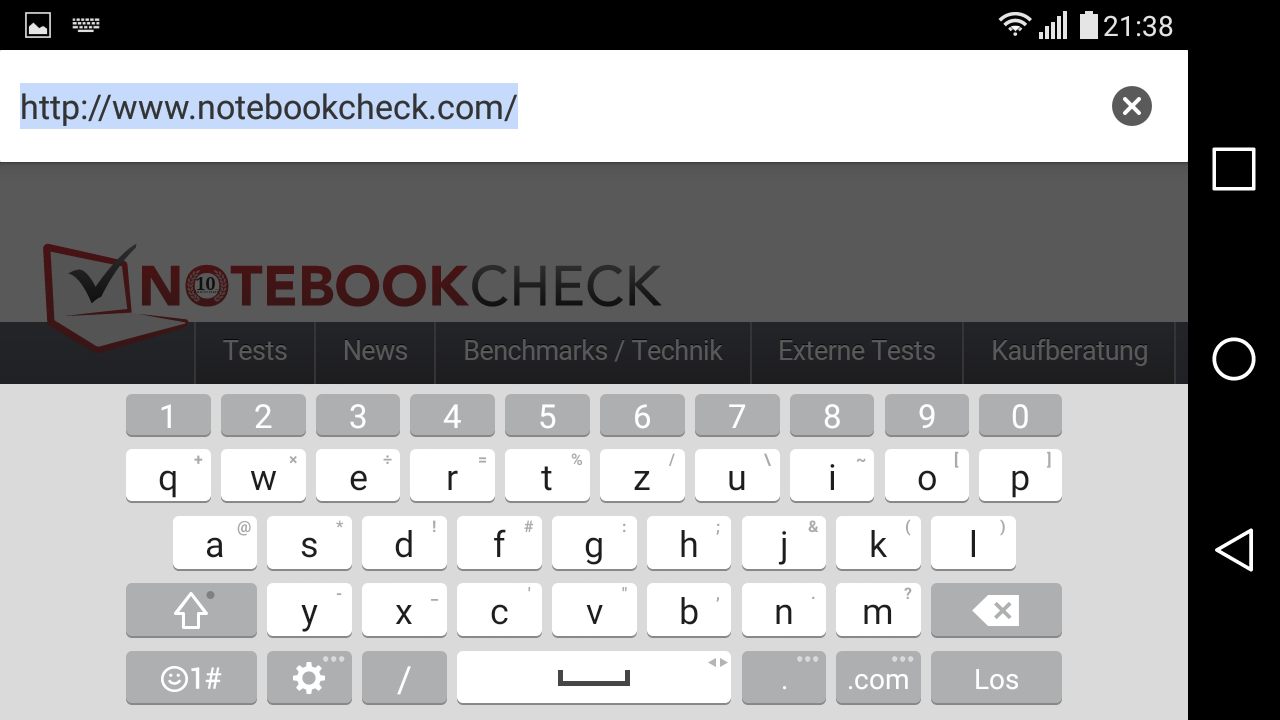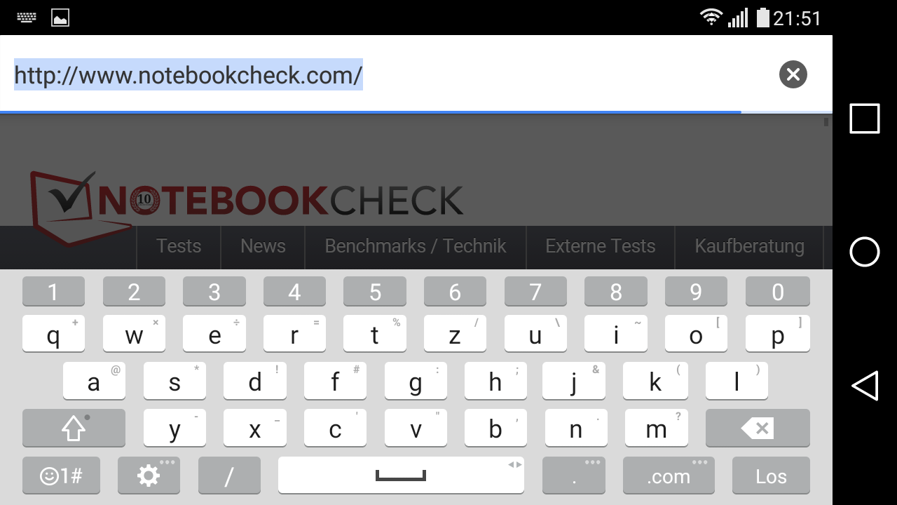 In unserem Testkandidaten kommt die virtuelle LG Tastatur zum Einsatz. Diese kann auf verschiedene Arten konfiguriert werden. Zu den wichtigen Punkten zählen: Tastaturhöhe, Layout, Pfadeingabe, Wortvorschläge, Autokorrektur, Feedback und optische Veränderungen. Im Hochformat hinterlässt sie als Eingabemedium einen guten Eindruck. Die Erkennung des Getippten verläuft ohne Probleme. Hin und wieder müssen wir allerdings eine kleine Verzögerung in Kauf nehmen. Besonders schnelle Schreiblinge könnte das stören. Im Querformat wirkt die Tastatur recht schmal. Dies kann jedoch in den Optionen korrigiert werden. Da LG keine physischen Tasten einsetzt, schränken die virtuellen Tasten den Bildschirm am unteren Rand (für den Homebutton etc.) ein. Dies fällt besonders im Querformat auf.