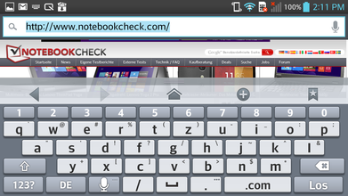 Einen guten Eindruck macht ebenso das virtuelle Keyboard, das aufgrund ausreichend groß dimensionierter Tasten bereits im Hochkantformat schnelle Eingaben erlaubt. In der Standardeinstellung wird oberhalb der Tastatur eine Zahlenreihe mit den Ziffern 0 bis 9 eingeblendet. Dazu kommt im Standardbrowser eine Navigationsleiste, um etwa die Favoriten oder die Homepage aufzurufen sowie um eine Webseite vor- oder zurückzugehen.