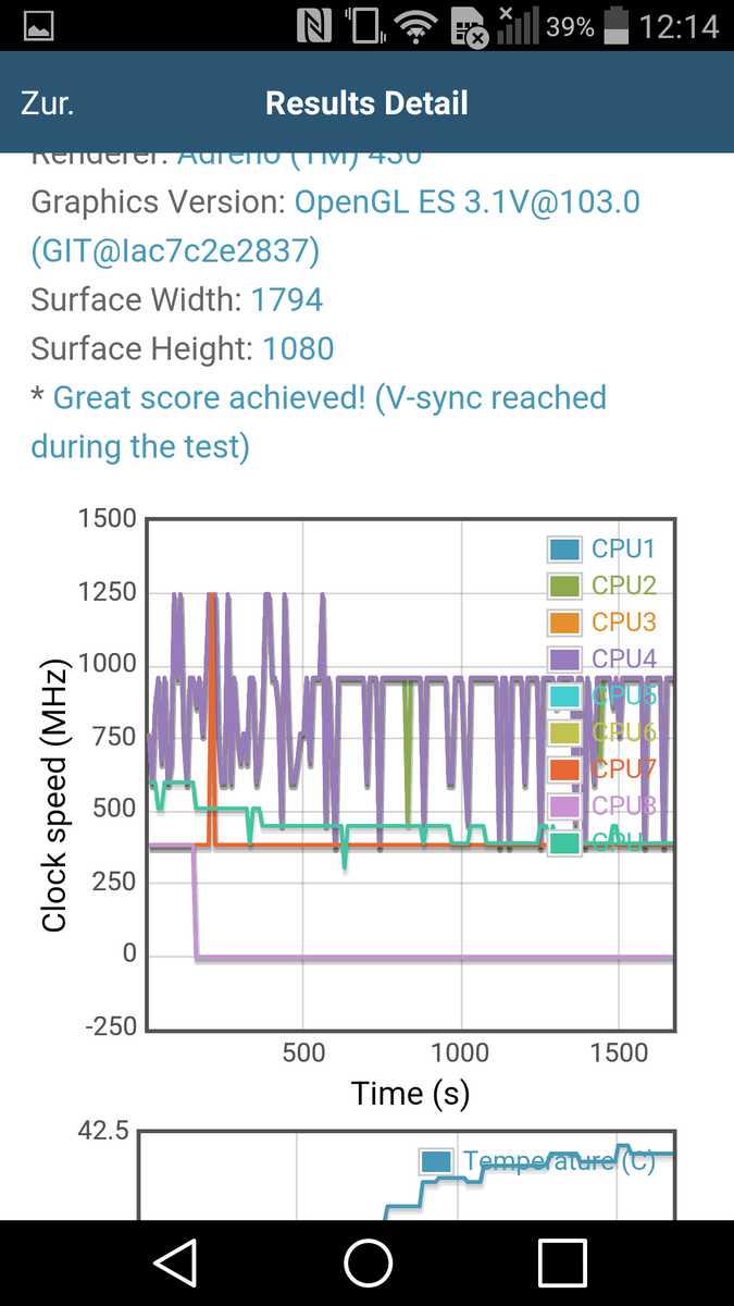 Mit dem Akkutest des GFXBenchmark überprüfen wir, ob das SoC auch über längere Zeit die volle Leistung erbringen kann. Die Grafiken zeigen recht eindeutig, dass die Leistung mit der Zeit deutlich abnimmt: Im Laufe der Zeit wird beispielsweise nicht mehr der volle Turbotakt des Prozessors erreicht, manche Kerne werden sogar komplett deaktiviert. Auch die GPU drosselt bei längerer Last, wodurch sich auch die geringeren Ergebnisse in den Benchmarks erklären lassen.