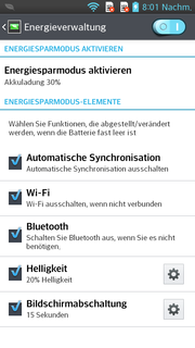 Die Leistungsaufnahme des LG G Pro Lite Dual bewegt sich im Idle-Betrieb auf einem guten Niveau und erreicht bis zu 2,0 Watt. Doch das Acer Liquid S1 (1,9 W) schafft sogar etwas weniger - trotz dem größeren und höher auflösenden Panel.