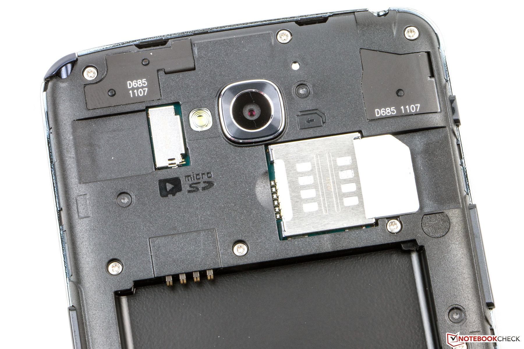 Der im Phablet untergebrachte Stylus sitzt sicher in seiner Arretierung und lässt sich dennoch einfach entfernen. Die kleine Aussparung auf der rechten Seite ermöglicht ein leichtes Öffnen der Gehäuserückseite, um an den Akku, den Speicherkarten-Slot und die Mini-SIM-Schächte zu gelangen. Die Abdeckung lässt sich leicht wieder aufsetzen und bleibt fest an Ort und Stelle. In summa hinterlässt das Testgerät einen guten Eindruck.
