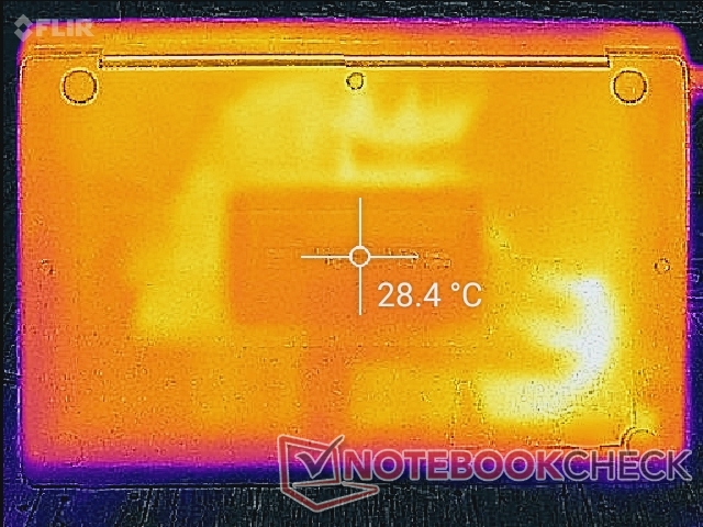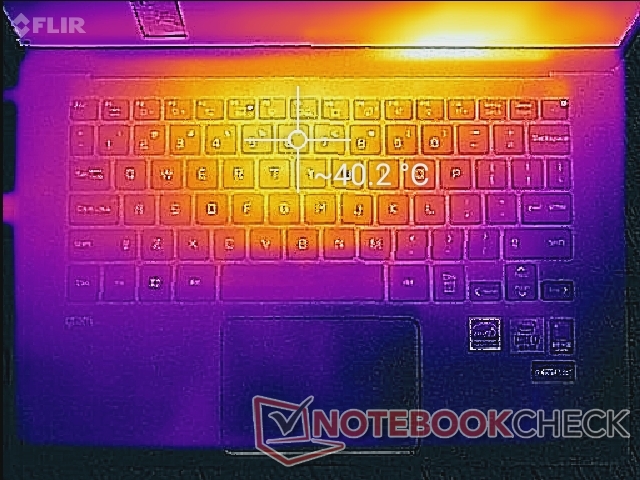 Im Leerlauf waren die Oberflächentemperaturen auf beiden Seiten des Gehäuses sehr gleichmäßig. Unter extremer Last kam es zu bis zu 40 °C heißen Hotspots, was noch immer kühler ist als bei den meisten anderen Subnotebooks, wie zum Beispiel dem Huawei MateBook D 14 oder Lenovo IdeaPad S940, die unter ähnlicher Auslastung jeweils über 45 °C erreichten. Die Handballenablagen, das Clickpad und ein Großteil der Tastatur blieben auch bei hoher Last vergleichsweise kühl und angenehm zu benutzen.