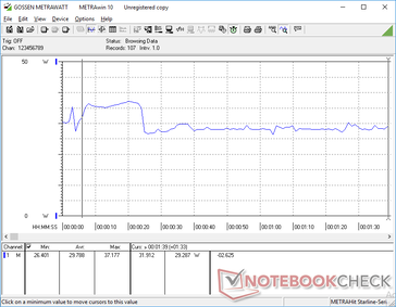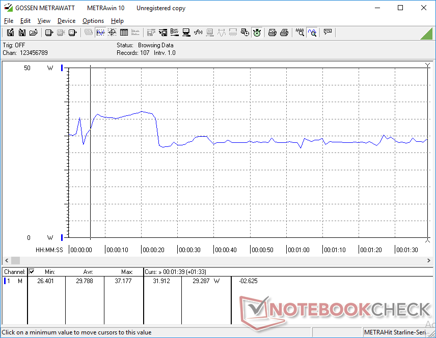 Kurzzeitig konnten wir bei der Ausführung von Prime95 und/oder FurMark ein Maximum von 39,5 W messen, die durch das kleine (ca. 9,7 x 6 x 2,7 cm) 48-W-Netzteil gezogen werden. Auch dies spiegelt unsere Beobachtungen der stark limitierten Turbo-Boost-Fähigkeiten des Systems wider. Nach einer Weile pendelte sich der Energiebedarf bei zwischen 25 und 30 W ein, was auf die weiter oben beschriebenen schwankenden Taktraten zurückzuführen ist.