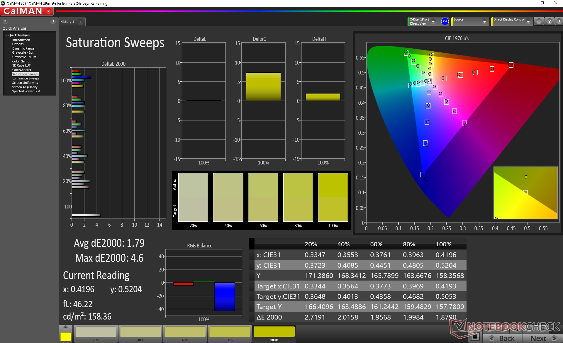 Weitere Messungen mit einem X-Rite-Spektralfotometer zeigen bereits im Lieferzustand eine genaue Darstellung von Farben und Graustufen, obwohl die Farbtemperatur etwas wärmer ist als üblich. Unsere Kalibrierung kann diese Abweichung nur leicht verbessern.