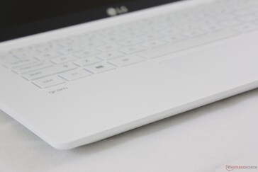 Das Gehäuse besteht aus Kohlefasern und Magnesium und hat eine MIL-STD-810G-Zertifizierung, die Schutz gegen Stürze, hohe und tiefe Temperaturen, Staub sowie Vibrationen und Stöße verspricht (weiter Infos dazu auf der englischsprachigen Produktseite). Die Basiseinheit fühlt sich trotz des geringen Gewichts sehr stabil an und unsere Verwindungsversuche führten nur zu minimalen Bewegungen und leichtem Knarzen - insgesamt erhielten wir einen sehr guten ersten Eindruck. Die Mitte der Tastatur ist etwas weicher, dies sollte aber nicht weiter stören. Die Stabilität der Basiseinheit des Gram 14 positioniert sich somit insgesamt nur leicht unterhalb der seiner Mitstreiter XPS 13, Spectre 13 und Blade Stealth.
