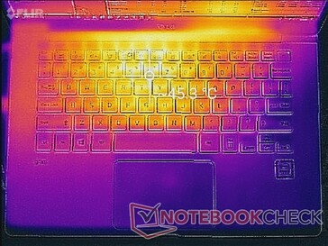 Die Oberflächentemperaturen sind im Leerlauf gering. Die wärmste Stelle befindet sich in der Mitte der Tastatur, in der Nähe des Prozessors. Unter maximaler Last steigt dieser Hotspot auf bis zu 45 °C, was für ein Ultrabook durchschnittlich ist. Manche Mitstreiter, wie etwa das XPS 13 oder das ThinkPad X1 Carbon, erreichen sogar über 50 °C, während das dickere Yoga C930 nur knapp die 40-°C-Marke überschreitet. Handballenablage und Touchpad werden unter keinen Umständen unangenehm warm.