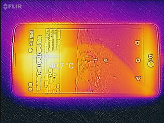 Sowohl im Leerlauf als auch unter Volllast behält das LG K7 einen kühlen Kopf. Selbst wenn man dem Smartphone alles abverlangt, wird es mit durchschnittlich 36,5 und 34,7 Grad Celsius an Ober- beziehungsweise Unterseite nicht mehr als handwarm. Dabei liegen die "heißesten" Stellen bei Werten um die 39 Grad Celsius. Im Idle-Modus messen wir maximal 33,7 Grad Celsius, aber zum größten Teil bewegen sich die Temperaturen nur im 31-Grad-Bereich.